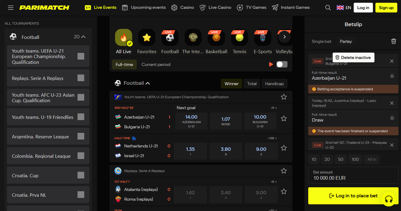 Live sázení patří mezi nejsilnější stránky Parimatch. Systém reaguje bleskově a dokáže přizpůsobit kurzy během vteřin. Statistiky, které běží u každého zápasu, umožňují sázet promyšleně – ne na slepo.