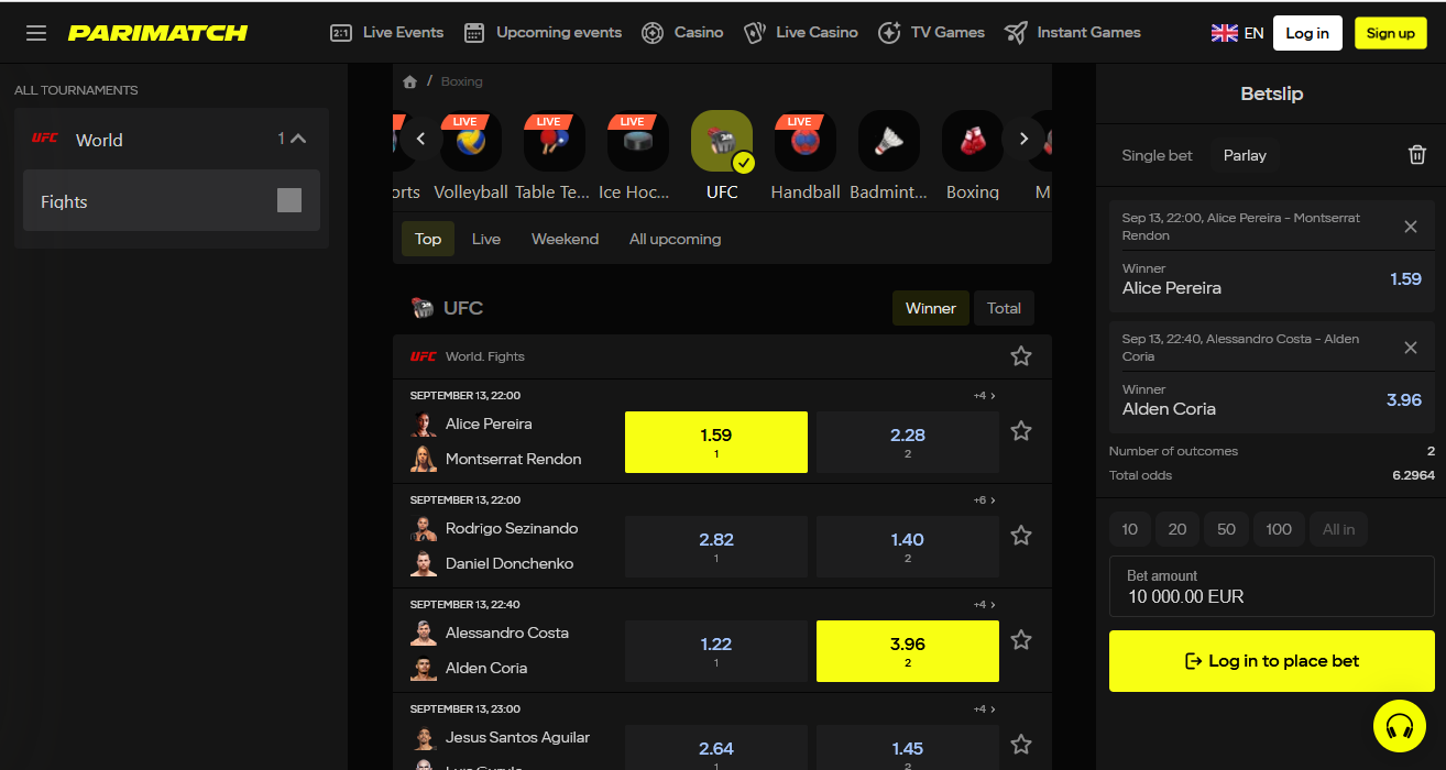Sekce sportovního sázení na Parimatch Czech Republic pokrývá desítky sportů a tisíce událostí denně. Dominuje samozřejmě fotbal – od české Fortuna ligy až po Premier League, Serie A, Bundesligu nebo kvalifikace na EURO a MS. Dále tu najdeš lední hokej, tenis, MMA, box, basketbal, ale i specialitky jako vodní pólo, šipky nebo e-sporty.